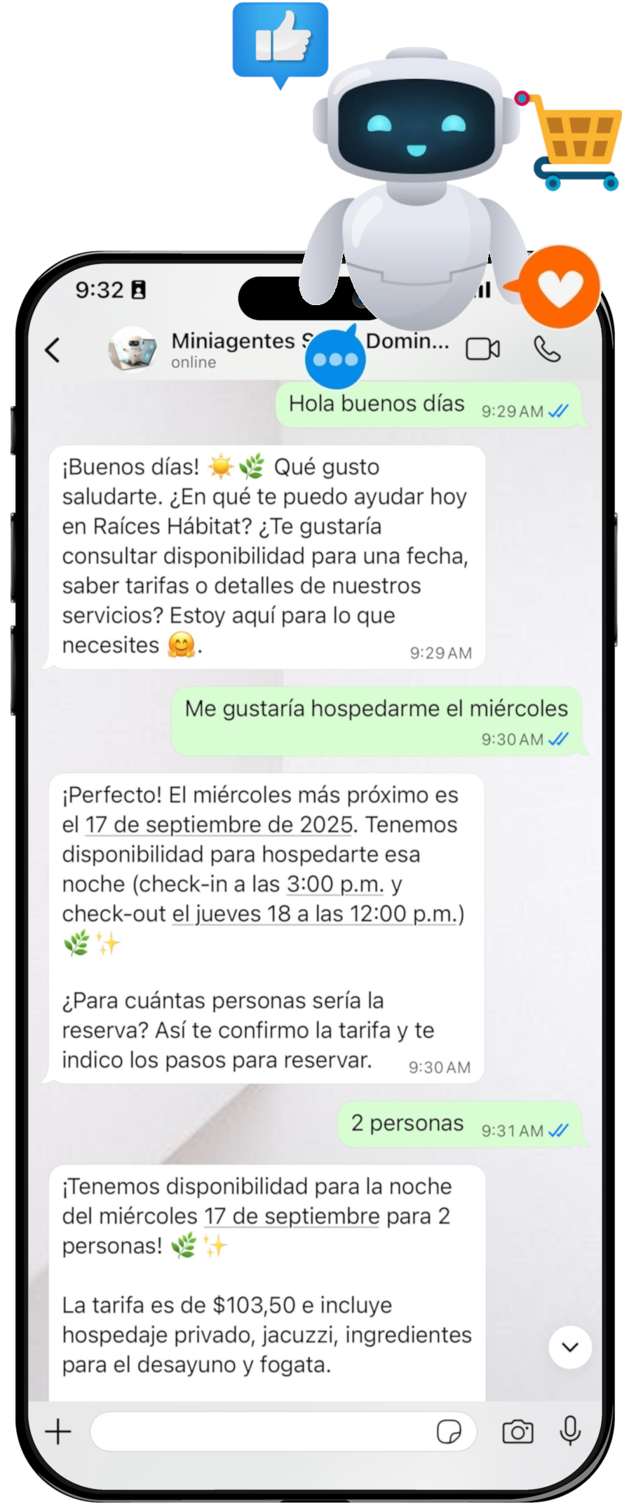 Tu MiniAgente atiende a tus clientes en cualquier momento del día, incluso mientras duermes o estás ocupado. Nunca más perderás una venta por no contestar a tiempo.